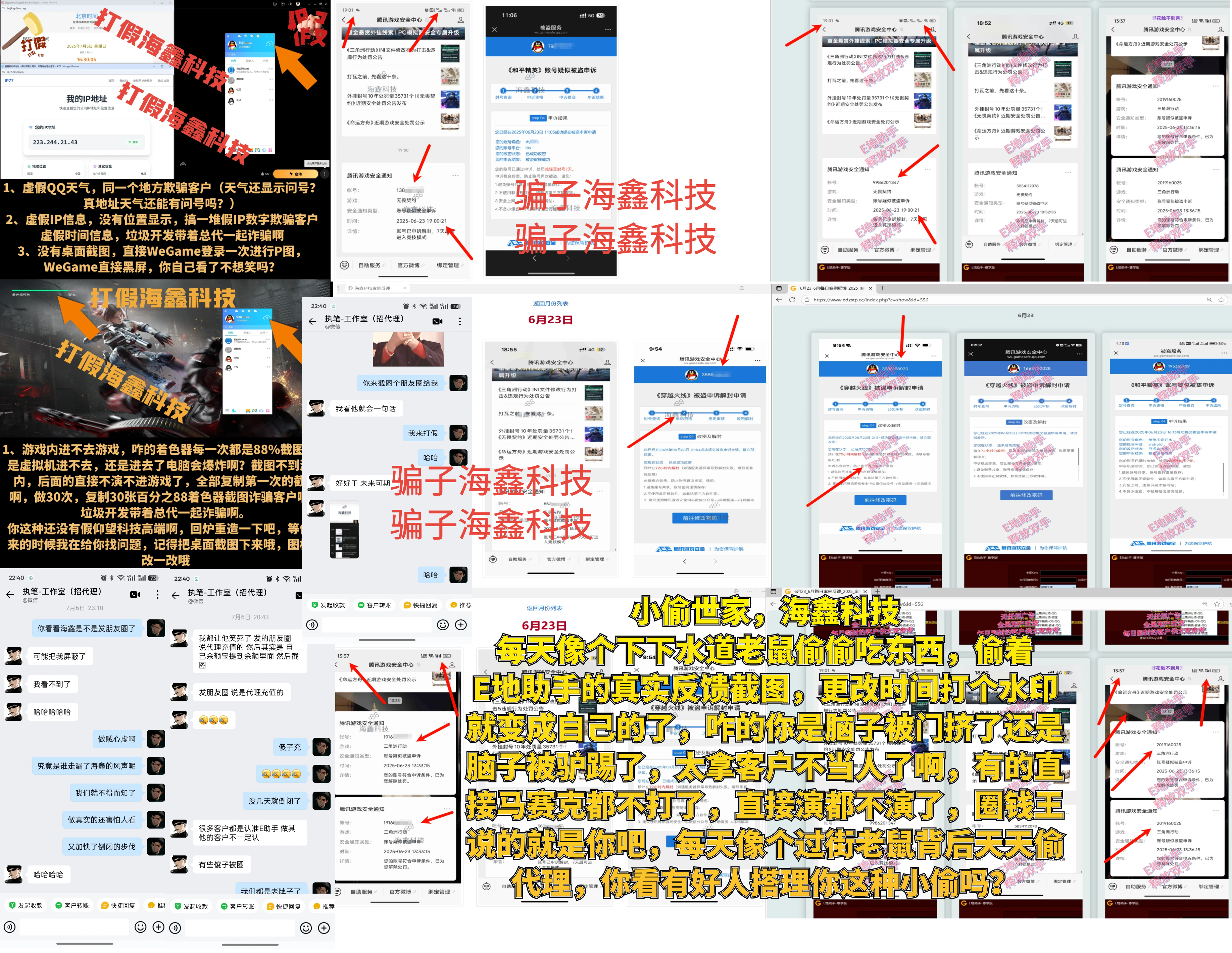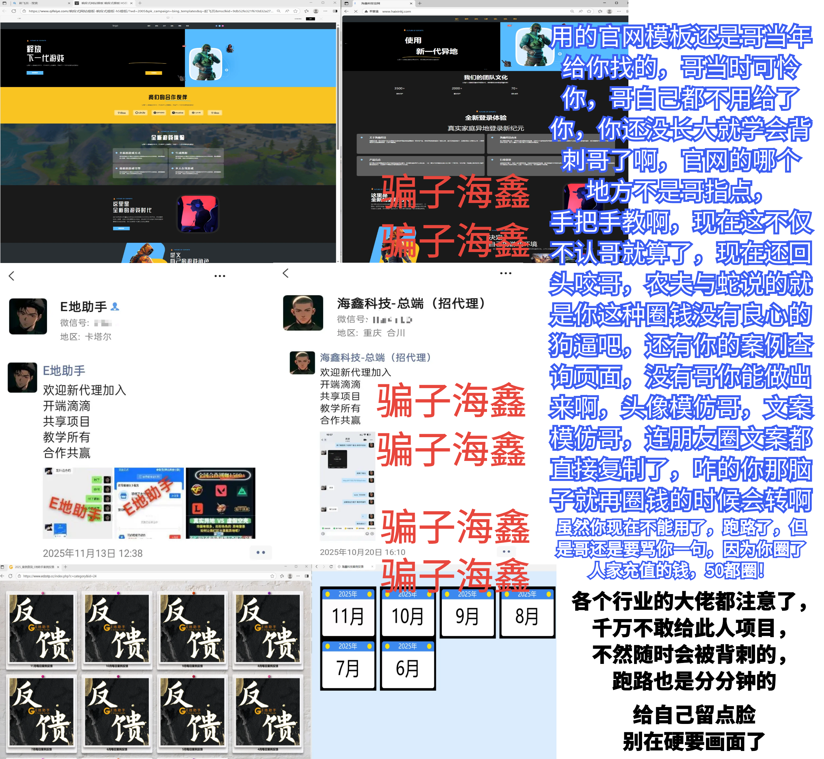 骗子海鑫科技,原为旗下的一个小代理,不知道是受了什么妖精蛊惑,不仅背刺上级,还每天恶意的黑上级,背后拉拢上级的代理和客户,并且从各个方面进行模仿抄袭,试问各位大哥、大佬,这种人做的项目能是真实的吗,还请各位老板大哥擦亮双眼,保护好自己的钱包,谨防上当受骗。